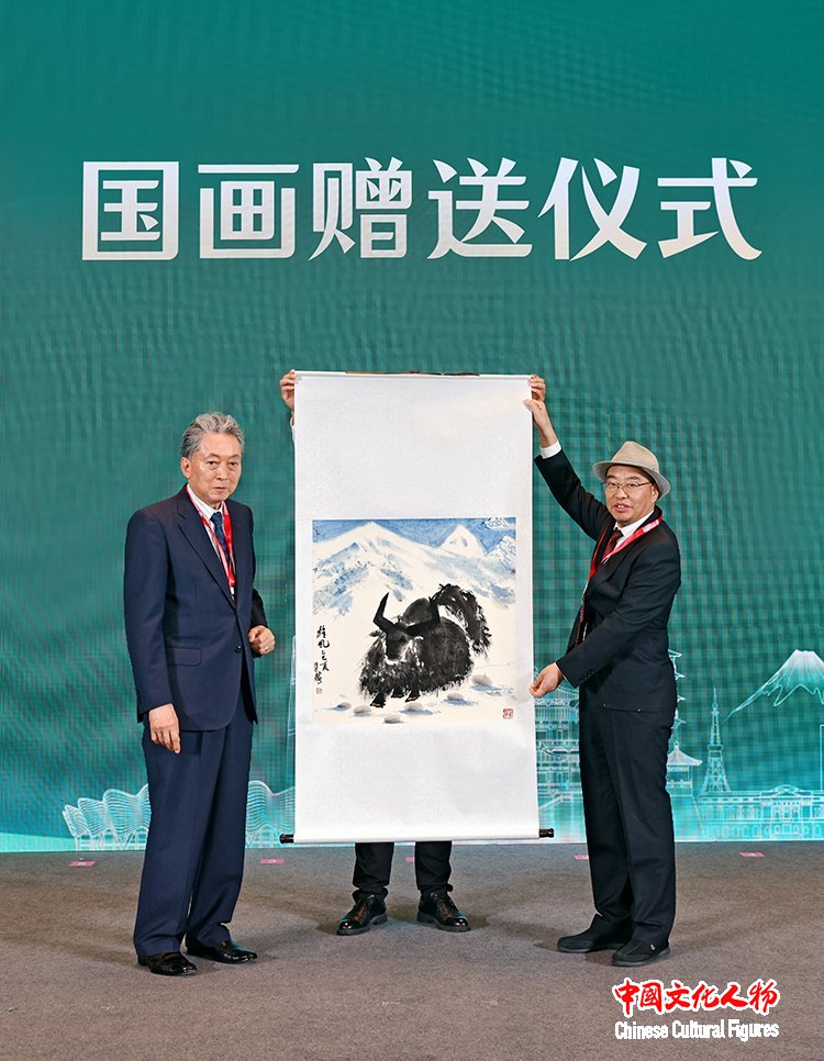中国书法家协会理事、中国美术家协会理事、西泠印社理事、民盟中央美术院副院长容铁向日本前首相鸠山由纪夫赠送自己创作的国画作品