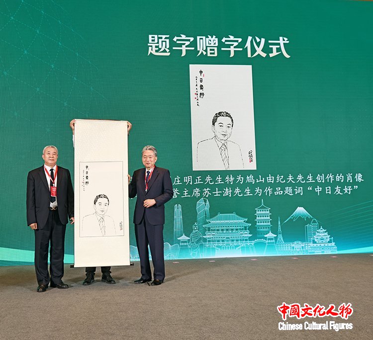 中国美术家协会理事、著名画家庄明正向日本前首相鸠山由纪夫赠送自己创作的肖像画