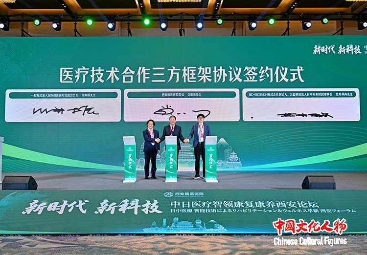 西安国医医院院长党明海代表西安国医医院与日本一般社团法人国际健康医疗促进会会长川井振,DC-BIOTECH株式会社创始人、干细胞培养基地理事长、公益财团法人日本未来财团理事长荒井利尚签署医疗技术合作三方框架协议