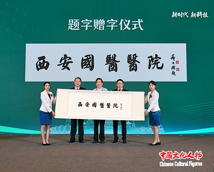 第十一届、十二届全国政协常委、中央文史馆馆员、中国书法家协会名誉主席苏士澍向西安国医医院馈赠“西安国医医院”匾额,并与中国国际康养科技学会会长、西安国医医院理事长周湛东,西安国医医院院长党明海合影留念