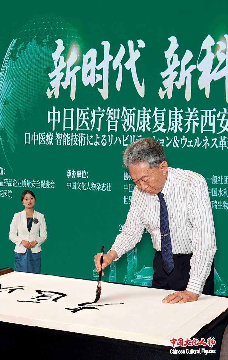 日本前首相鸠山由纪夫挥毫泼墨为西安国医医院题写“以医友爱”