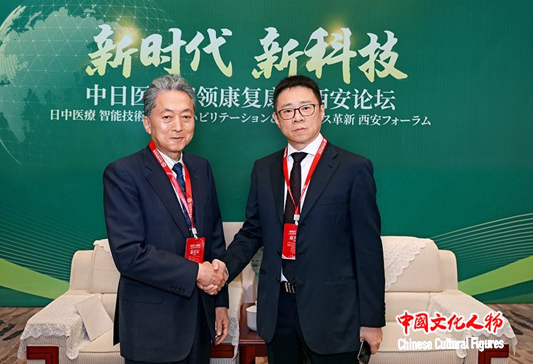 日本前首相鸠山由纪夫在论坛开幕式现场会见中国国际康养科技学会会长、西安国医医院理事长周湛东并亲切交流