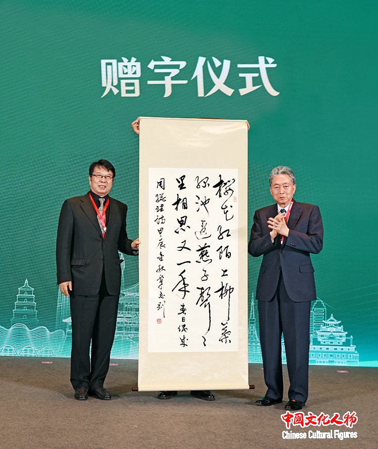 日本前首相鸠山由纪夫在开幕式现场欣然挥毫,以笔端温情传递对论坛的热烈祝贺之意