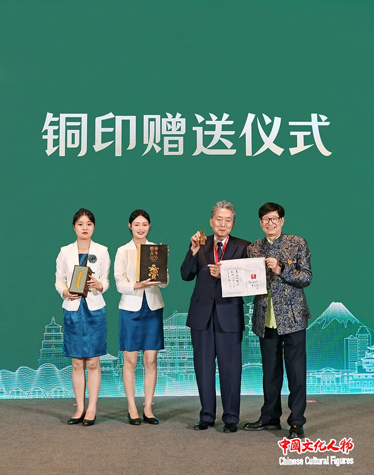 中国工艺美术大师、国家级非遗铜雕技艺代表性传承人朱炳仁向日本前首相鸠山由纪夫赠送自己创作的紫铜印玺