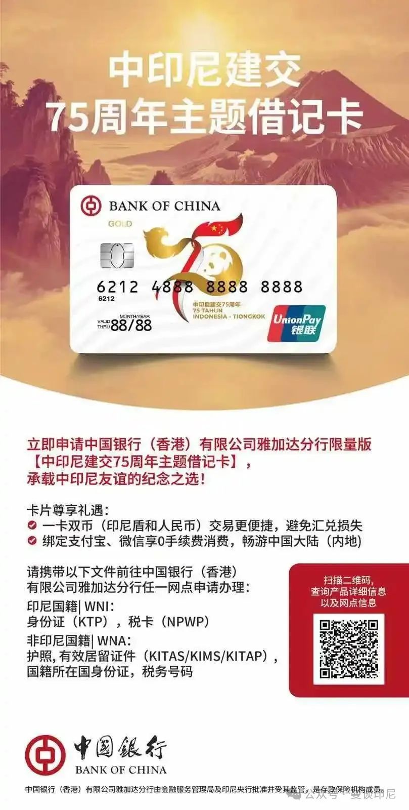 献礼中印尼建交75周年,由中国银行(香港)有限公司雅加达分行(“中银雅加达分行”)与银联国际携手推出的限量版【中印尼建交75周年主题借记卡】,已于近日正式在中银雅加达分行各柜台全面上架。广大客户即日起可亲临雅加达各网点,现场办理申请,抢先拥有这张承载中印尼友谊的纪念之选。