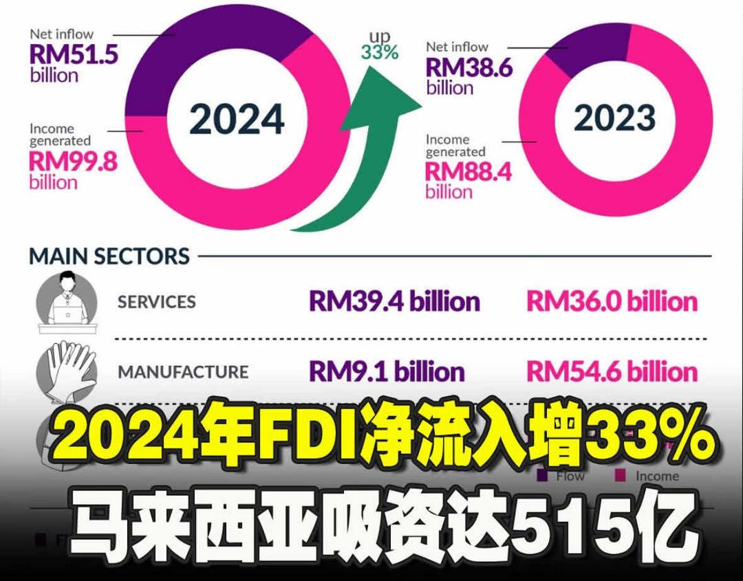 2024年马来西亚的外国直接投资(FDI)表现强劲,净流入达515亿令吉,比2023年的386亿令吉增长33%。此外,2024年所带来的收入高达998亿令吉,同样高于去年的884亿令吉。
