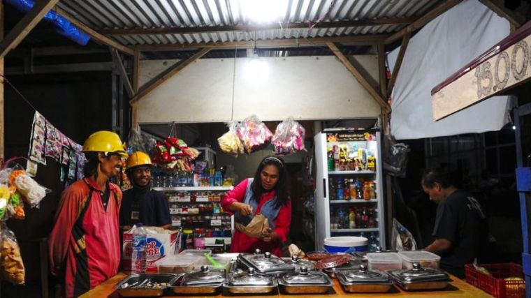 随着IMIP园区内镍加工厂的运营,大量外来务工人员涌入,推动当地消费需求激增。一位自2018年就在此经营餐馆的老板表示,2024年10月园区工厂投产后,客流量大幅增加,促使他将营业时间延长至24小时,并扩大用餐区域,目前雇佣了18名员工,包括厨师、服务员和送餐员。