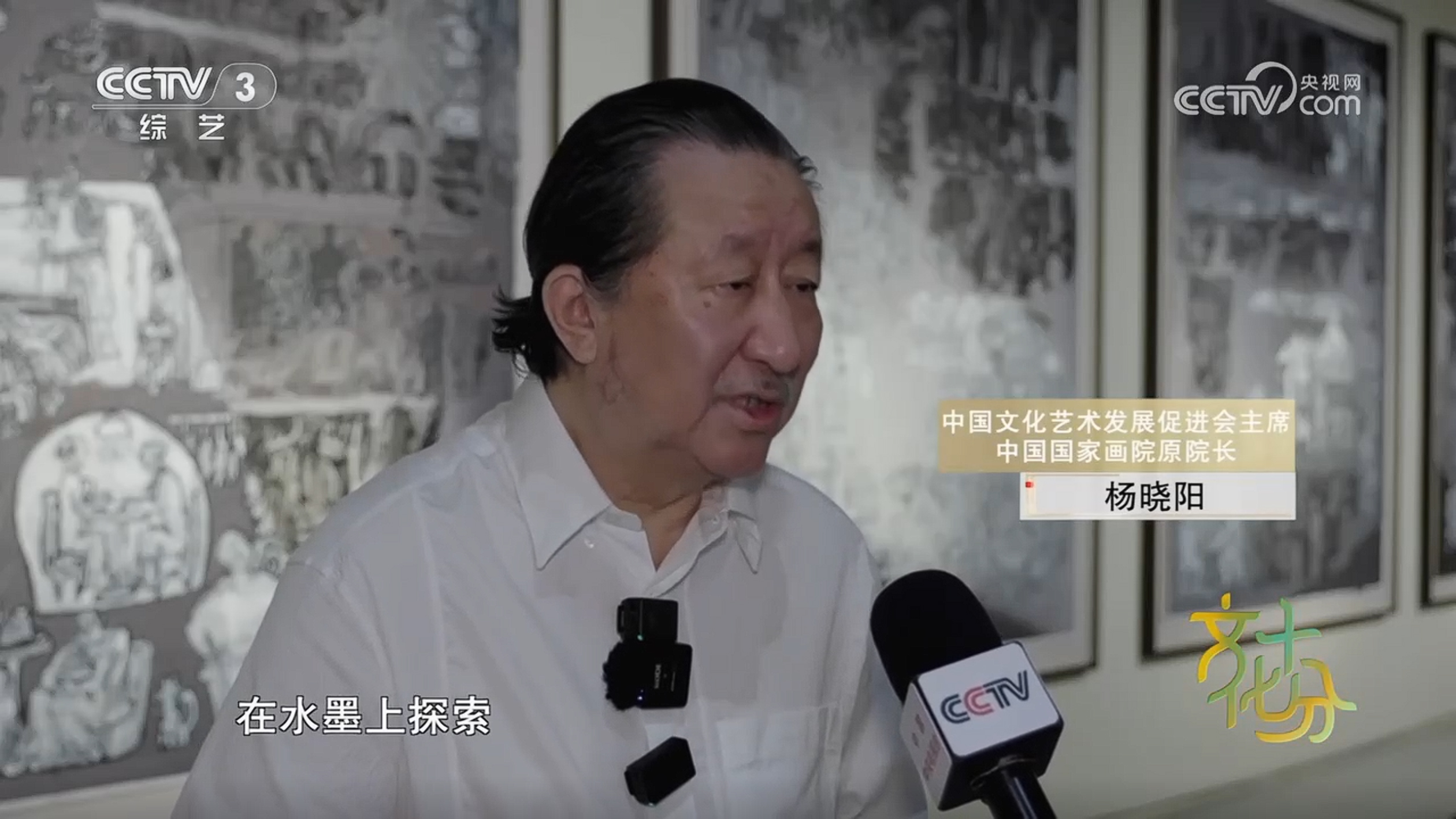 中国文化艺术发展促进会主席 中国国家画院原院长 杨晓阳:我把南北的舞龙舞狮的形象进行了综合,以苦水社火整体的队列来拉开这个规模。然后填补了全国的社火的各种内容,在里头形成比较丰富的一个民间艺术非遗的一个场景。我采取了线描加这个大块墨色陪衬的办法,发挥了中国书画同源的这样的一个特色。对于中国画的发展,在水墨上探索是一个永远完结不了的话题。