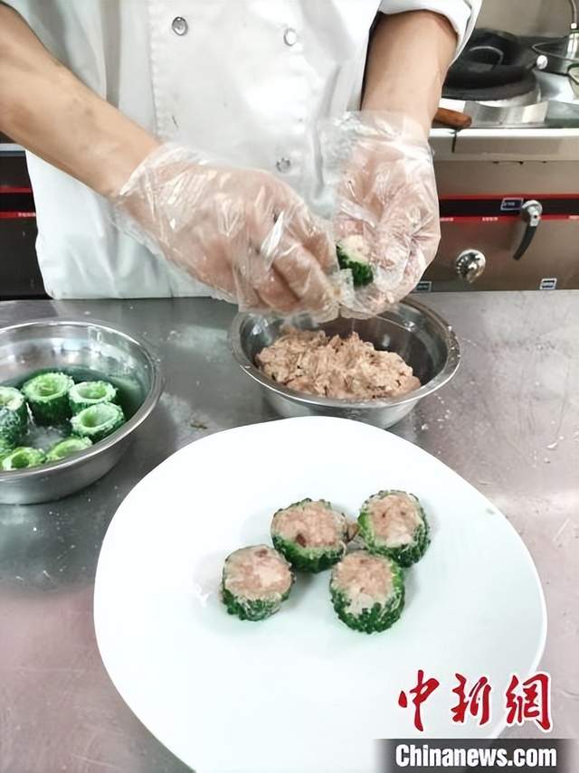 6月11日,广东信宜市,厨师正在制作“苦瓜宴”中的“酿苦瓜”。戴云海 摄