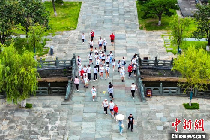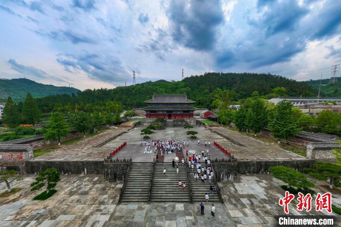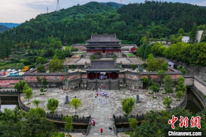 7月16日,2025年海外校友子女“湖北寻访之旅”夏令营营员走进湖北武当山玉虚宫,来自美国、法国、加拿大等10个国家和地区的100名海外校友子女和校友领队一览武当建筑,感受武当文化。据了解,玉虚宫始建于明永乐年间,是武当山建筑群中最大的宫殿之一。图为2025年海外校友子女“湖北寻访之旅”夏令营营员走进湖北武当山玉虚宫。(无人机照片)张倩龙 摄