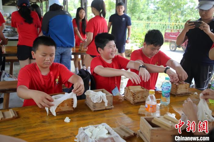 7月13日,华裔青少年们走进合肥市长丰县马郢村农耕课堂学习制作传统豆腐,沉浸体验推磨磨豆的辛劳与乐趣。 范志昂 摄