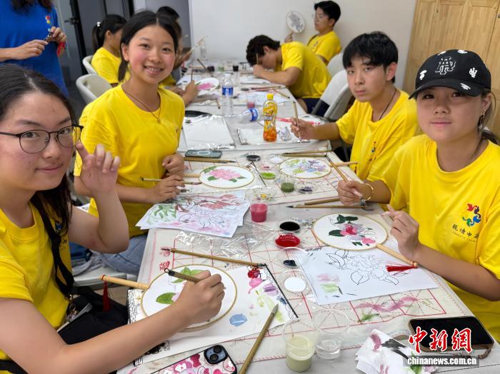 7月12日,参加2025“亲情中华·中国寻根之旅”夏令营北京营的华裔青少年们在荣宝斋体验绘制团扇。(受访者供图)