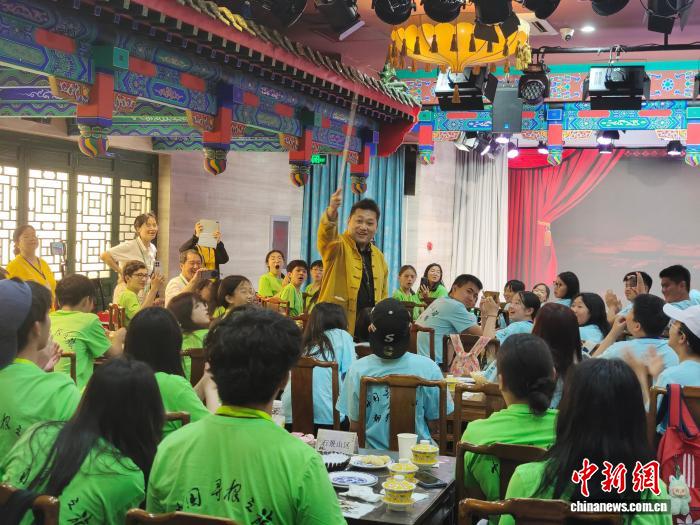 7月16日,参加2025“亲情中华·中国寻根之旅”夏令营北京营的华裔青少年们在老舍茶馆观看古彩戏法表演。中新社记者 吴侃 摄