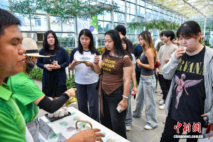 7月20日,2025海外华裔大学生海南研习活动走进屯昌梦幻香山旅游区,图为华裔大学生参观芳香植物科普馆,品尝芳香茶饮。中新网记者 骆云飞 摄