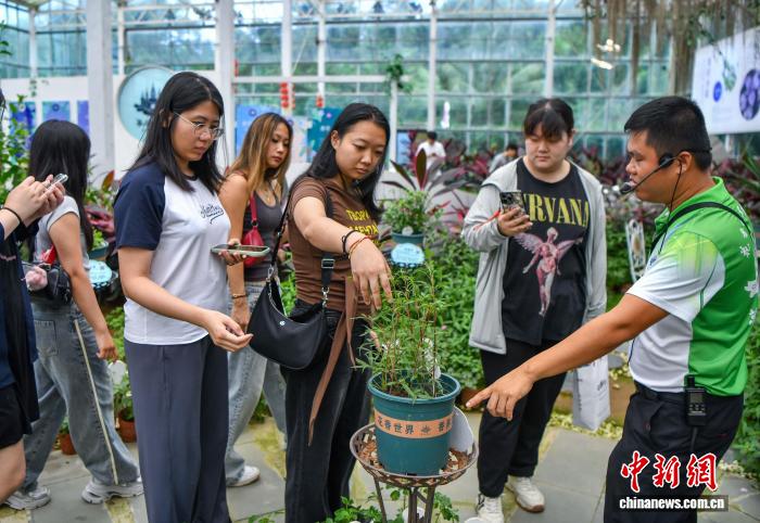 7月20日,2025海外华裔大学生海南研习活动走进屯昌梦幻香山旅游区,图为华裔大学生参观芳香植物科普馆。中新网记者 骆云飞 摄
