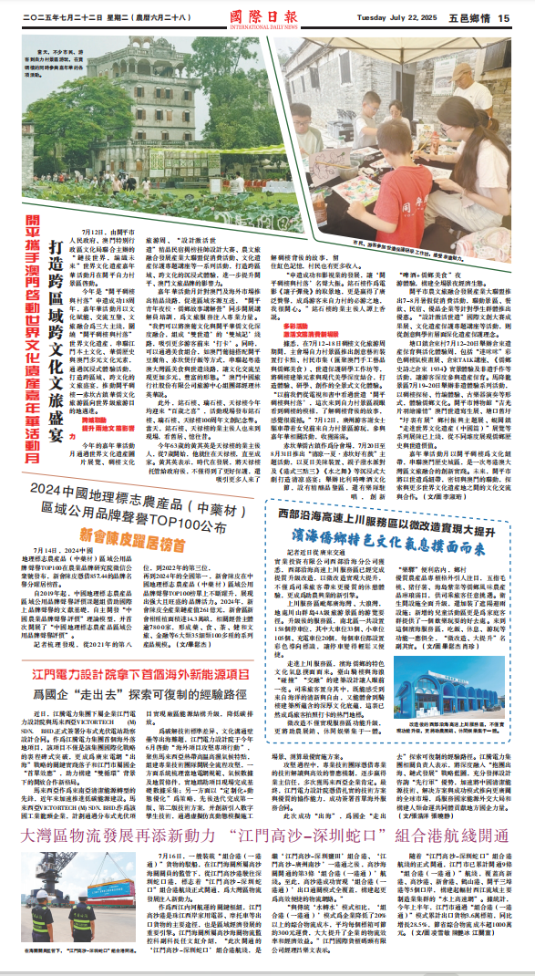 嘉年华活动月针对澳门及海外市场推出精品线路,促进区域客源互送,“开平青年夜校·侨乡故事讲解营”同步开展讲解员培训,为文旅服务注入专业力量。“我们可以将澳葡文化与开平华侨文化深度融合,组成‘双世遗’的‘双城记’线路,吸引更多游客前来‘打卡’。同时,可以通过美食组合,如澳门葡挞搭配开平豆腐角、赤坎煲仔饭等方式,串联起粤港澳大湾区美食与世遗线路,让文化交流呈现更加多元、丰富的形态。”澳门中国旅行社股份有限公司旅游中心组团部经理林英华说。