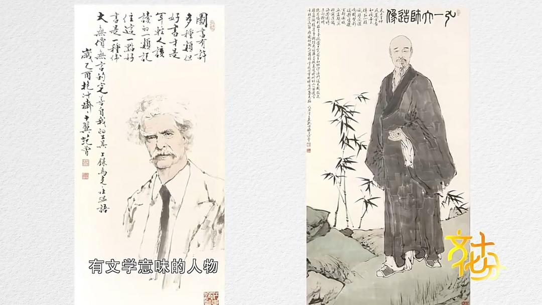 范曾:中国的弘一大师是近代中国一个最卓越的和尚,他生长在一个天津的豪门之家,他在看透了社会以后入了佛教,吃饭、生活都要非常简朴。后来他临死的时候写了四字:悲欣交集。一方面感到离开人世间的悲伤,一方面感到他回归自然的欣快。他这四个字给我们很大的启发,所以我画这两个有文学意味的人物来作为我的作品,都是用的写意的方法画的。我想人性都有真善美的一面,而这两个人他们的毕生经历体现了他们的真善美。