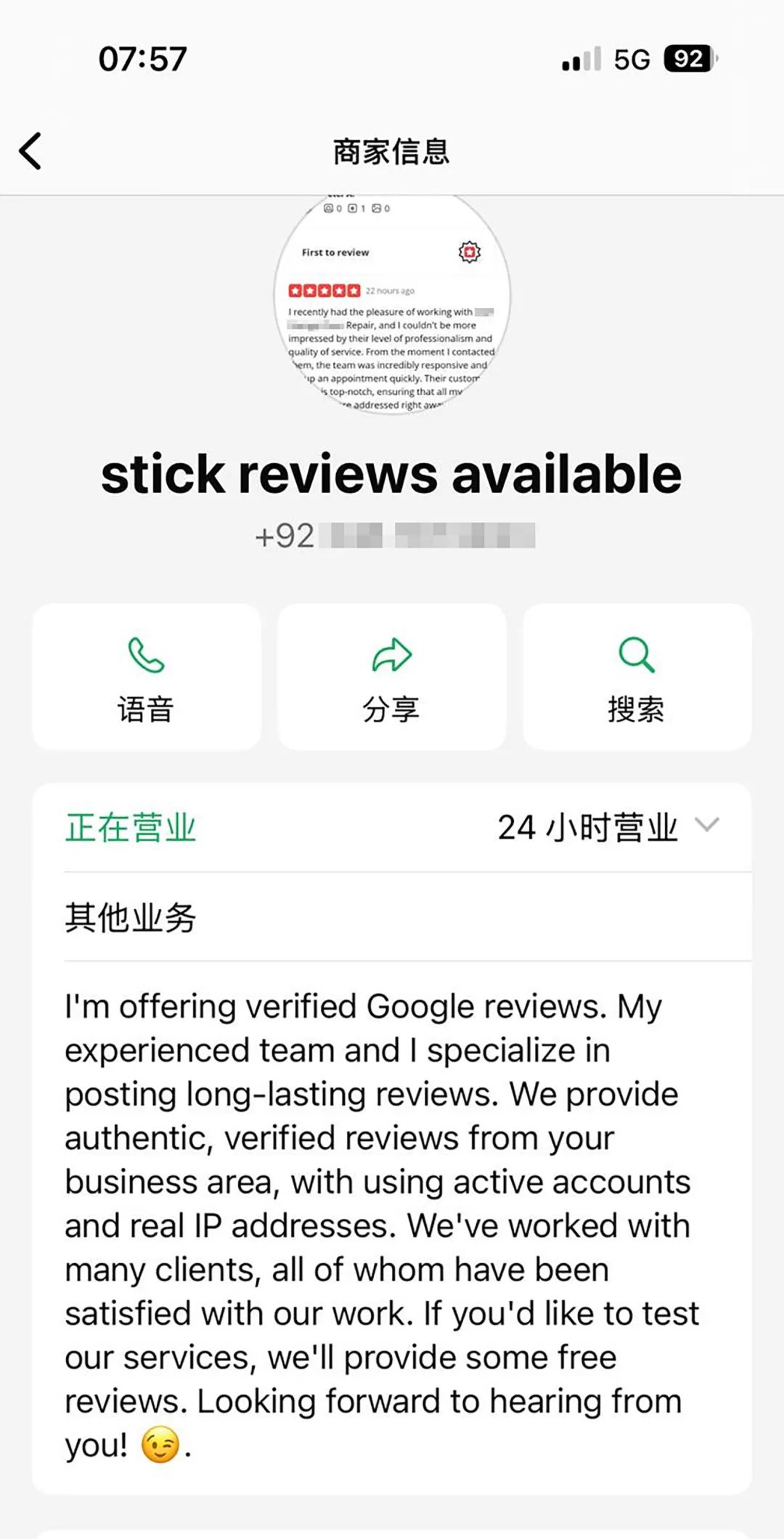 他指对方先在网页上留下一则好评,然后通过WhatsApp联系他,称可帮助他把公司的评分“推上去”。