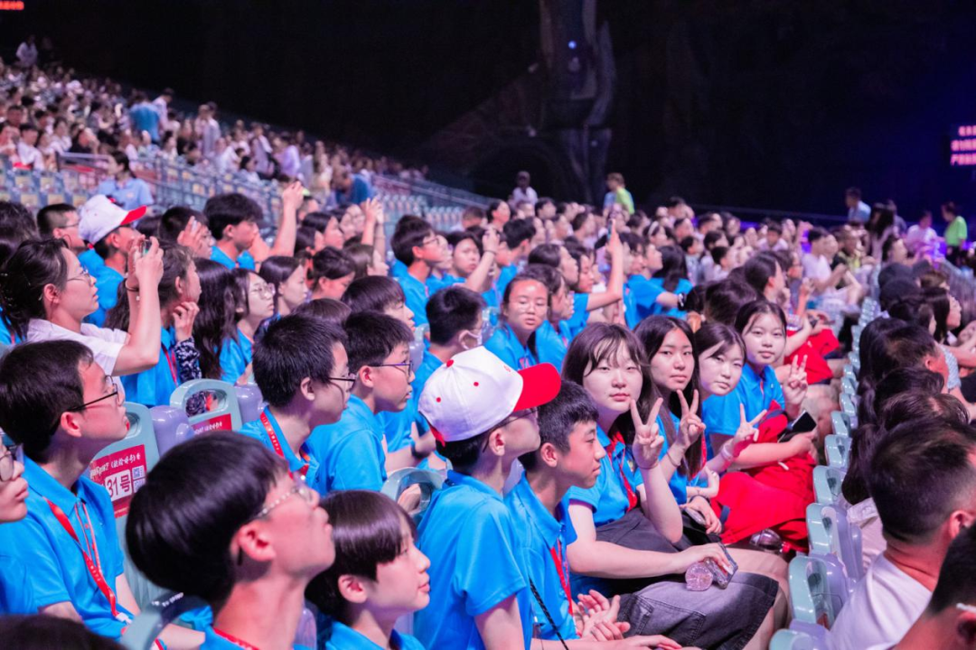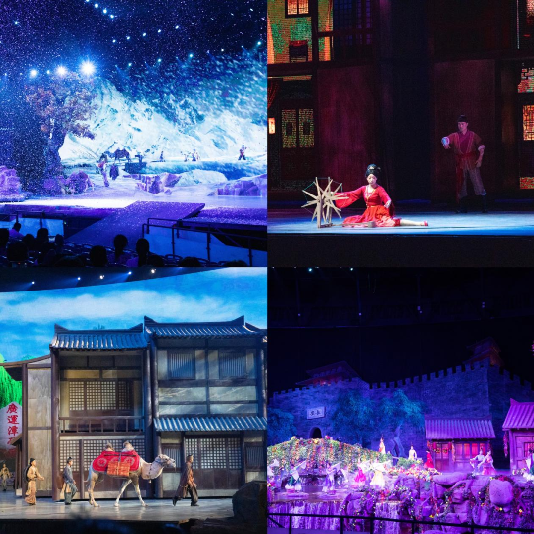 夜幕垂落,华夏文旅大剧院内《驼铃传奇》实景演出磅礴启幕。270度旋转舞台将营员瞬间卷入大漠风烟。驼队穿越飞沙走石、狼群环伺,僧人西行矢志不渝,异域商旅踏浪东来……逼真的舞台效果,让营员们身临其境。