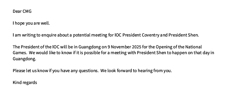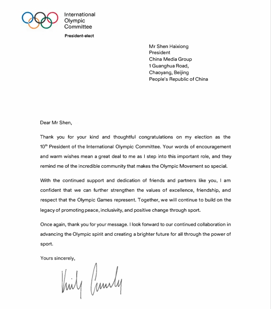 国际奥委会主席考文垂复函总台:全力推进与总台全方位合作