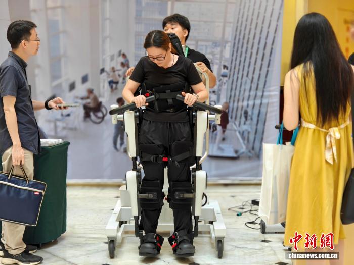 图为与会人员体验下肢康复机器人。叶秋云 摄