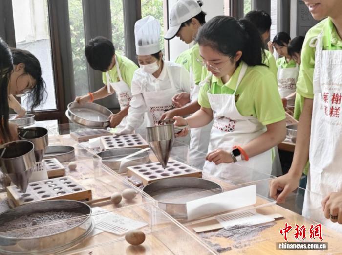 装料、筛粉、填框、注馅、成型……师傅讲完动作要领,营员们便跃跃欲试,将米粉倒入金属筛中,有的营员筛粉时力道不均,导致粉层忽厚忽薄;有的营员筛粉时动作过猛,导致米粉撒落。尽管动作还不标准,但营员们都全神贯注,忙得热火朝天。