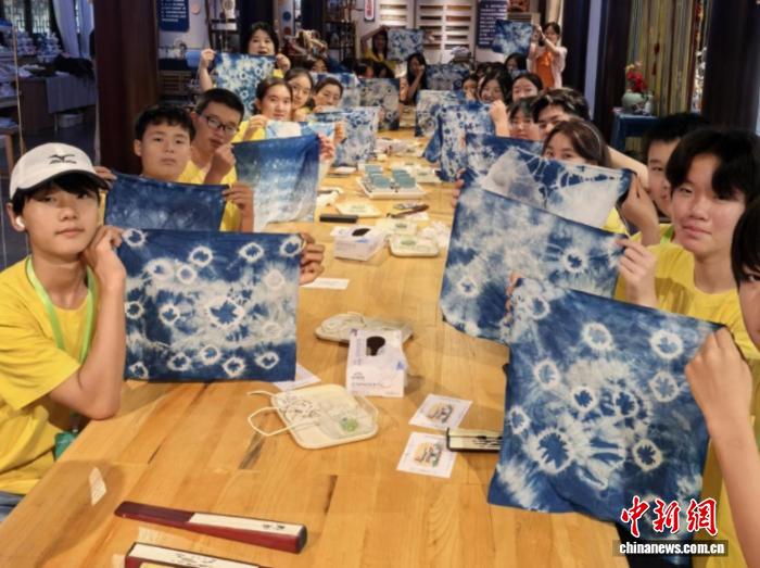 布料折叠、捆扎、浸染、固色、清洗……营员们还在现场动手制作了属于自己的扎染作品。当一块块素白的棉布经过染色、拆线和洗涤后,呈现出独一无二的蓝白花纹时,营员们纷纷惊喜地展示自己的成果。“太神奇了,不同的捆扎方式能创造出完全不同的图案,这比机器印染更有趣。”来自日本的营员王北辰说。