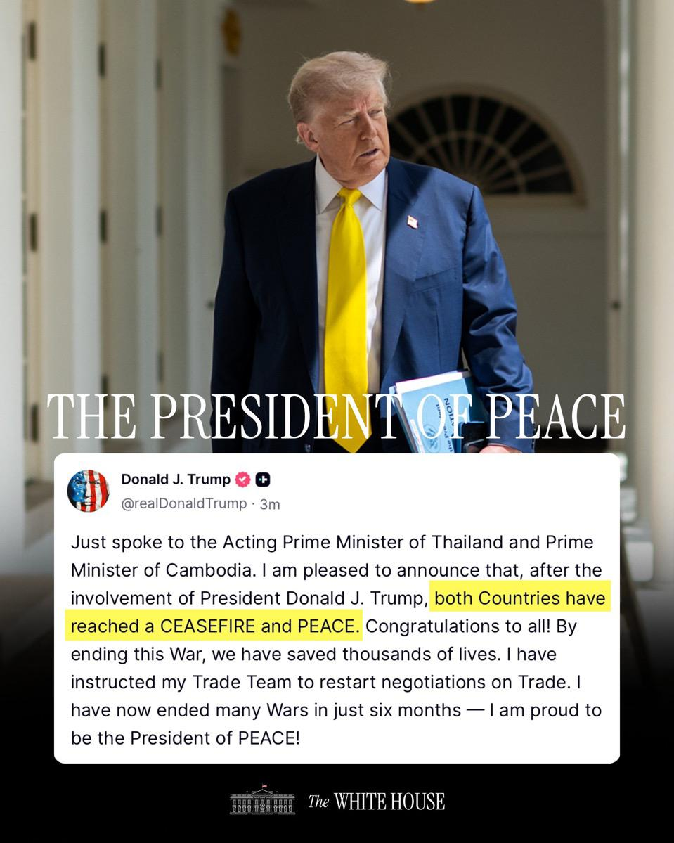 “我为身为‘和平总统’(President of Peace)而感到骄傲!”19日,特朗普在社媒发文,指在他亲自介入下,泰国与柬埔寨已达成停火与和平协议,并自诩为“和平总统”,声称此举成功挽救了数以千计生命。