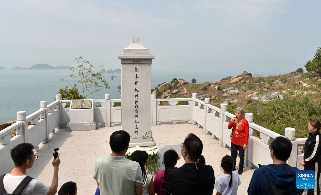 Lin Zhen (3rd R) recounts the heroic deeds of the soldiers of the Hong Kong Independent Battalion of the Dongjiang Column, an anti-Japanese aggression guerrilla force under the leadership of the Communist Party of China, at a monument in memory of a group of anti-Japanese aggression martyrs in Lung Kwu Tan in the western part of Tuen Mun District of Hong Kong, south China, March 15, 2025.(Xinhua/Chen Duo)
