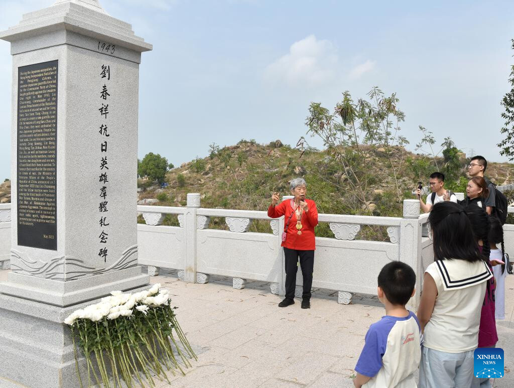 Lin Zhen, recounts the heroic deeds of the soldiers of the Hong Kong Independent Battalion of the Dongjiang Column, an anti-Japanese aggression guerrilla force under the leadership of the Communist Party of China, at a monument in memory of a group of anti-Japanese aggression martyrs in Lung Kwu Tan in the western part of Tuen Mun District of Hong Kong, south China, March 15, 2025.(Xinhua/Chen Duo)