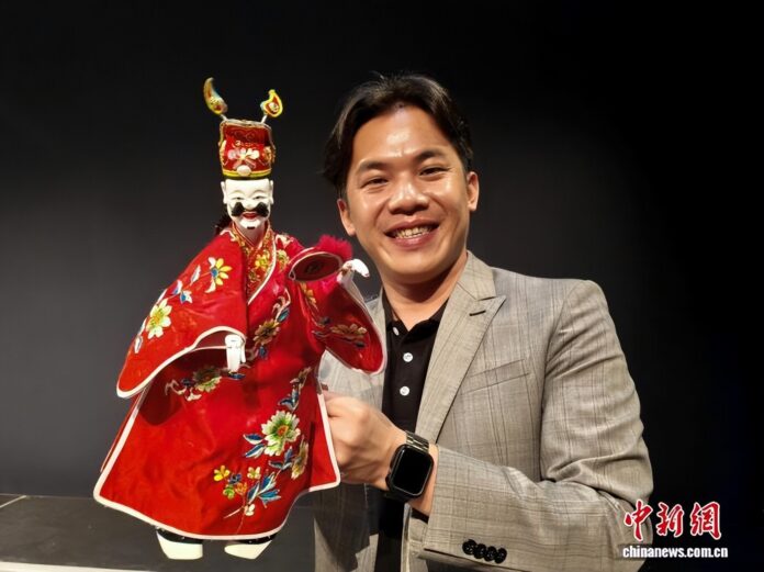 图为台北木偶剧团主演吴声杰展示布袋戏戏偶。中新社记者 张晓曦 摄