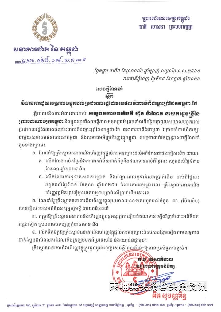 7月29日,柬埔寨国家银行发布通告,宣布将采取一系列措施,减轻因柬泰边境冲突而受影响民众的经济负担。
