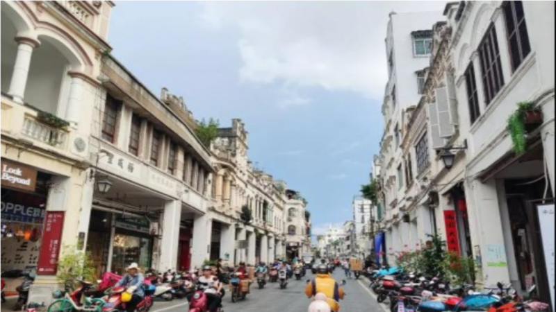 “骑楼”是一种典型的外廊式建筑,建筑物前设置有顶盖的人行道或走廊。可以当避风雨侵袭、遮挡阳光照射,在东南亚很受欢迎。从南洋返乡的华人,将这种建筑风格带回了我国福建、广东、海南、广西等省的沿海地区。