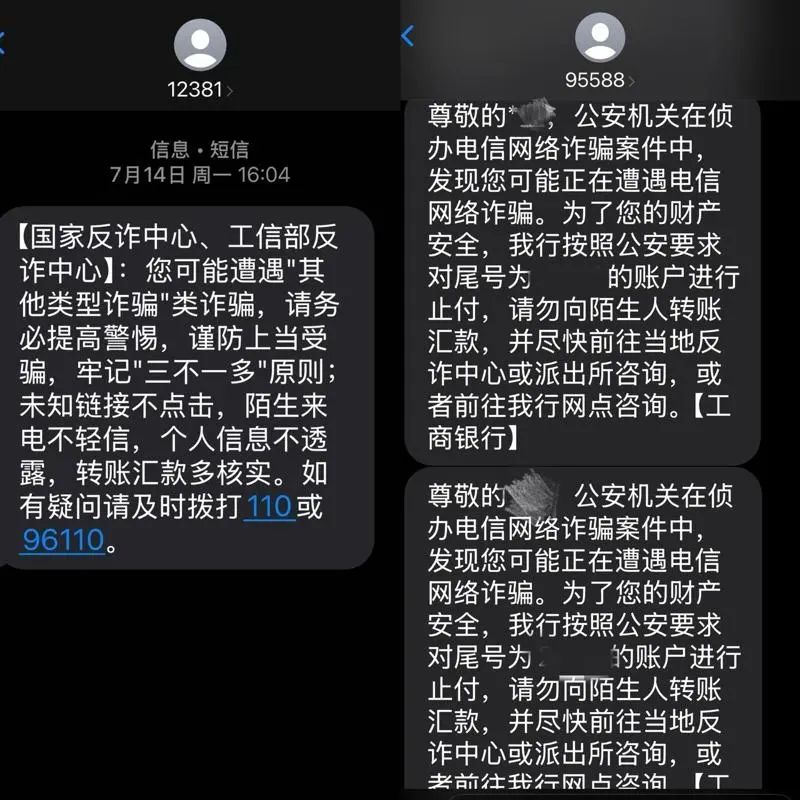 刘女士收到的来自国家反诈中心和银行短信,提醒她可能遭遇「其他类型诈骗」类诈骗。(图/刘女士提供)