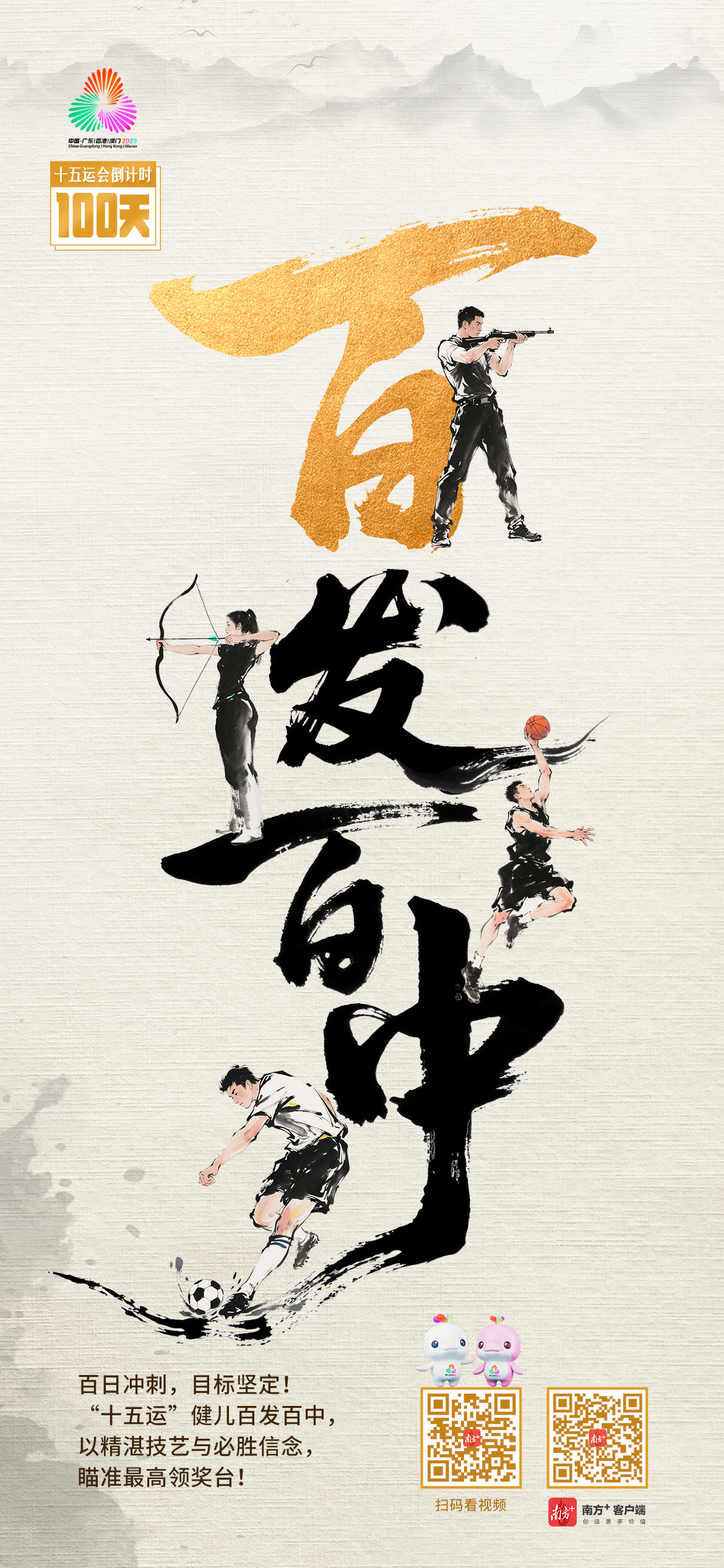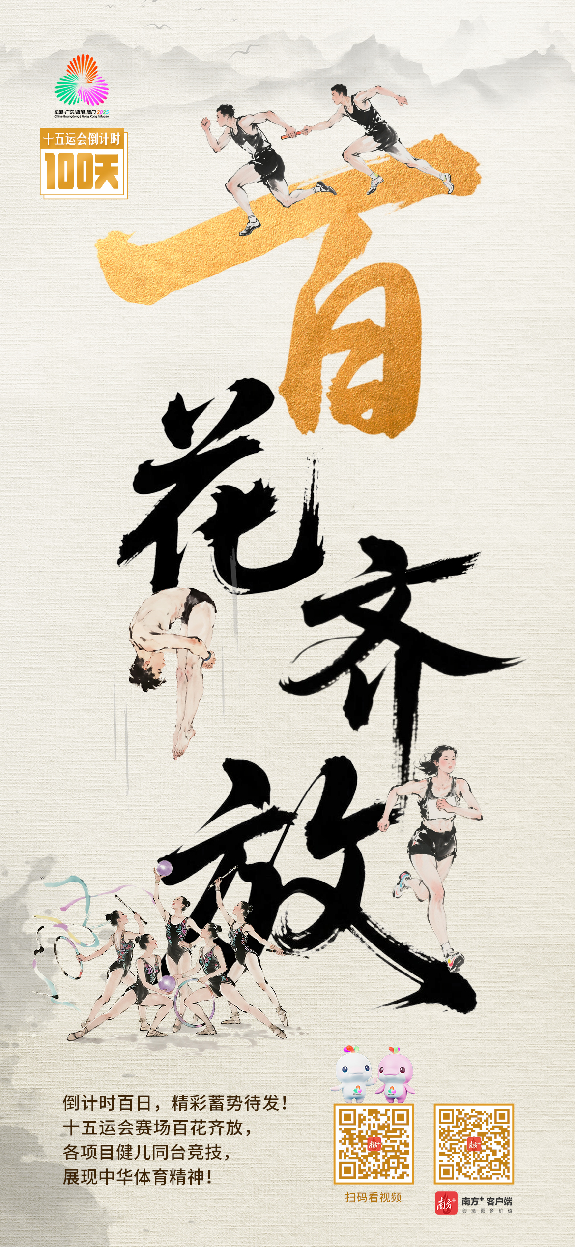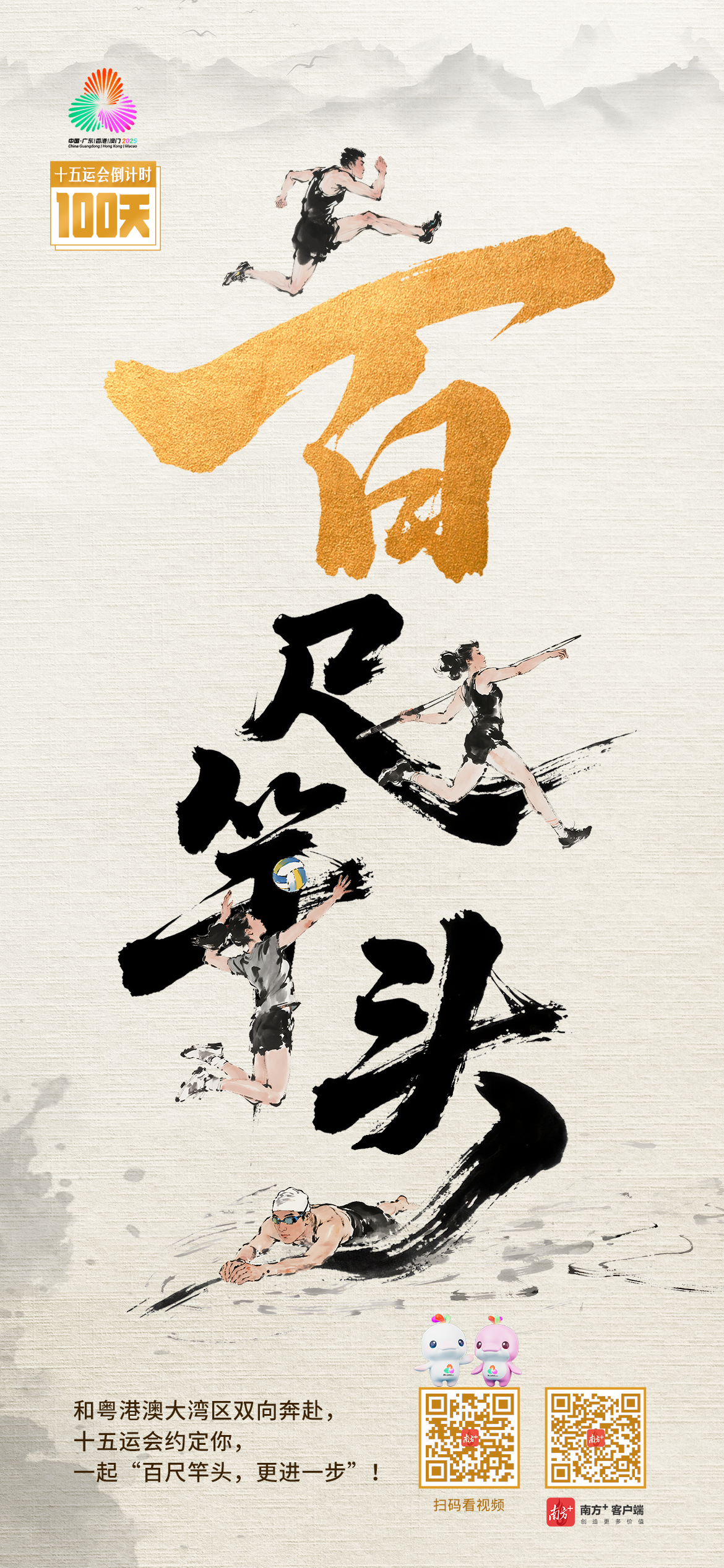 百日冲刺,粤港澳将为全国人民送上一届精彩纷呈的全运盛会,南方+也以“百”字为线索,推出系列创意海报,为运动健儿加油助威。