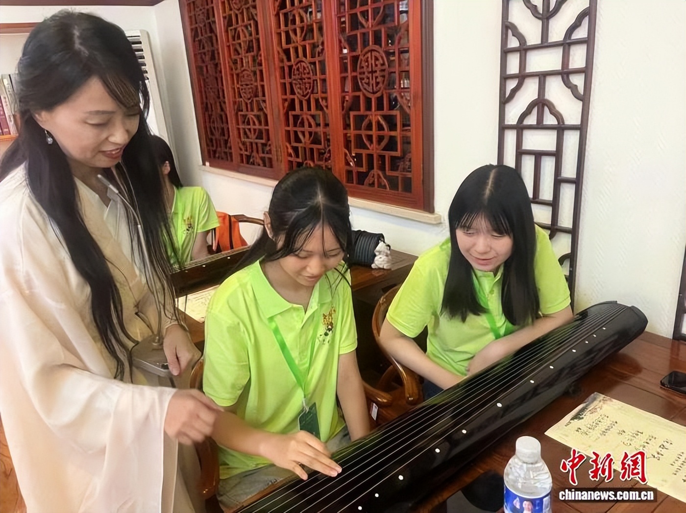“独坐幽篁里,弹琴复长啸。”古琴以其音淡、声稀,琴意得之于弦外,深受文人喜爱,列为“四艺”(琴棋书画)之首。在国学课堂上,华裔青少年触摸琴身上的十三个徽位,并了解“天圆地方”的琴体构造所蕴含的哲学思想。在授课老师指导下,华裔青少年从最基础的“散音”开始练习,虽然初学难免生涩,但是当《沧海一声笑》的旋律在教室内此起彼伏响起时,大家都很有成就感。