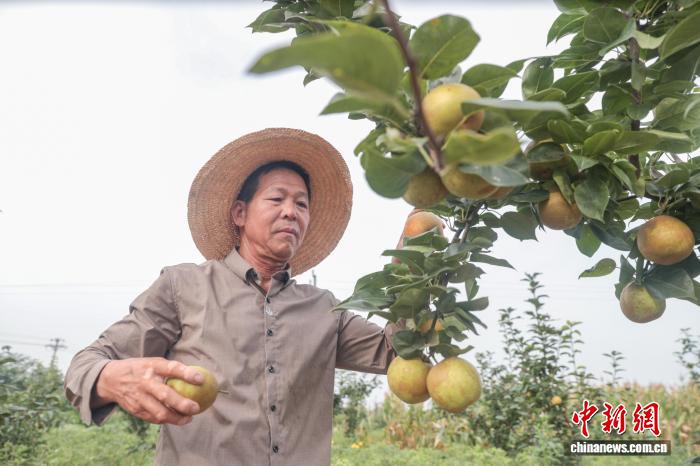 从南昌赶来的游客秦洪华摘下一颗翠冠梨,清洁后放进嘴里。“肉质脆嫩、汁多味甜!”他说。