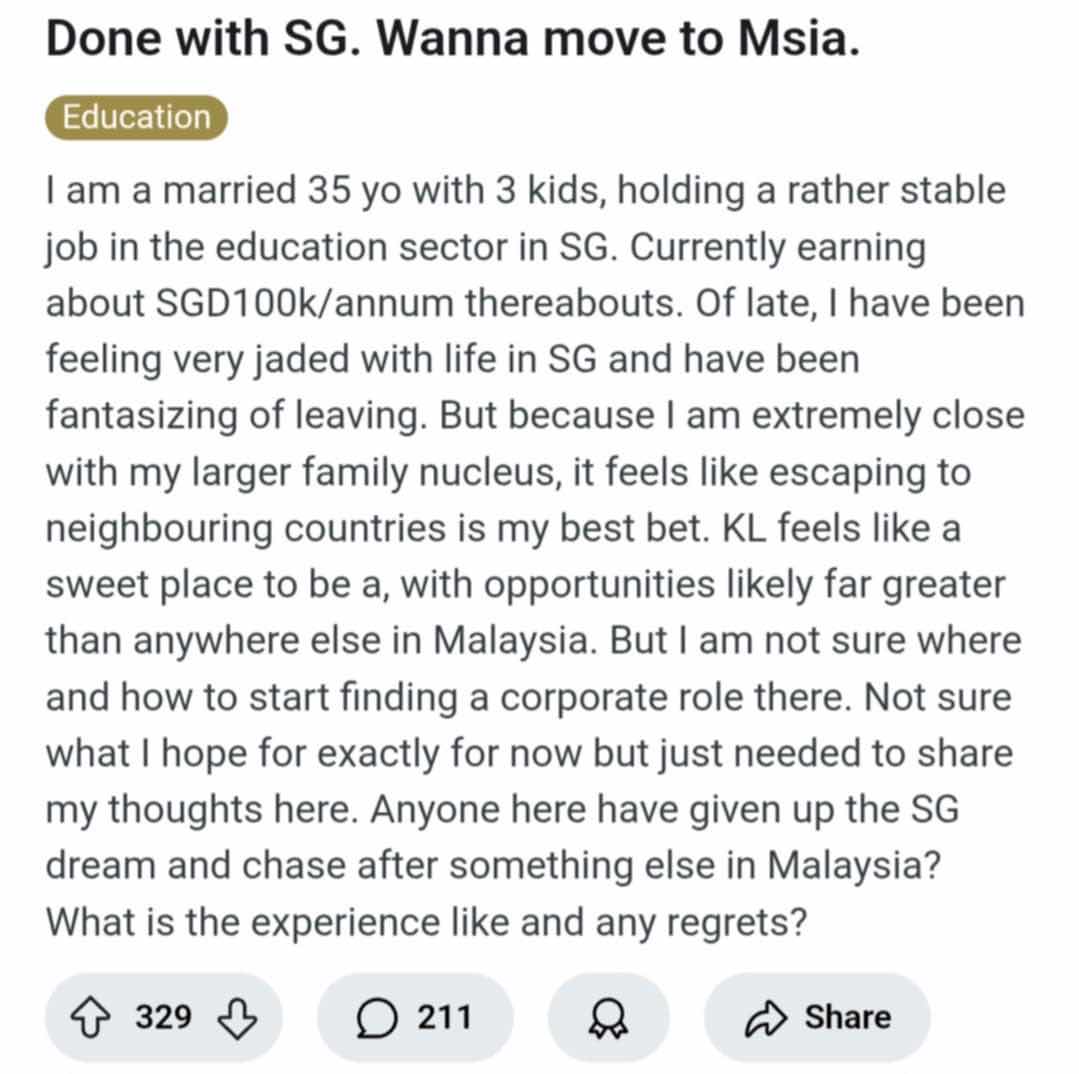 男子也询问道,是否有人也曾有类似念头,放弃“新加坡梦”选择到马来西亚生活,并想了解这是什么的经验,以及是否会留下遗憾。