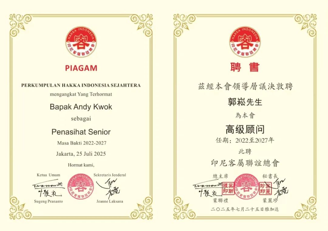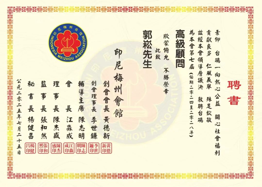 值得关注的是,郭崧会长近期先后获聘担任印尼客属联谊总会及印尼梅州会馆的高级顾问。这一荣誉身份充分肯定了其在团结海外客属社团、推动中印尼民间友好方面的关键作用。