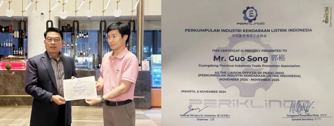 △图为印尼电动车工业汽车协会主席Moeldoco(左1)为郭崧会长(右1)颁发印尼新能源车工业协会中国首席联络官聘书