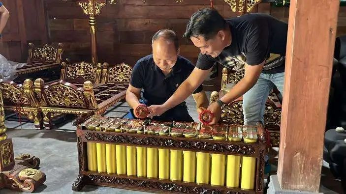 探访甘美兰工坊,Wibowo老师现场指导演奏。广西艺术学院艺术研究院供图
