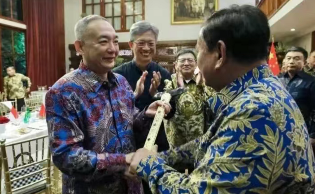 从官方发布的照片可见,会面气氛友好热烈。许学强上将身着蓝紫色调印尼传统蜡染衬衫,普拉博沃总统则穿着蓝金色蜡染服饰,展现了双方对文化交流的重视。在官邸门廊迎接时,普拉博沃总统还向许学强上将赠送了象征友谊的克里斯短剑(keris),这是印尼最具代表性的传统武器之一。