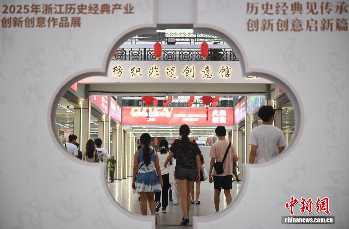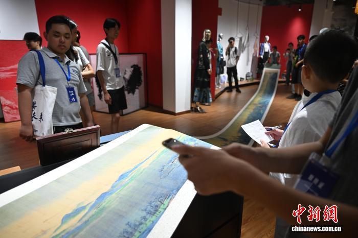 8月7日,欧洲华裔青少年参观13米长的《千里江山图》织锦画。当日,“浙江大学国际联合商学院(ZIBS)世界与未来青少年暑期学校——2025年欧洲时报文化中心欧洲华裔青少年浙江行”走进嘉兴海宁,来自法国、德国的30名华裔青少年在海宁中国家纺城了解中国布艺的创新发展。中新社记者 王刚 摄