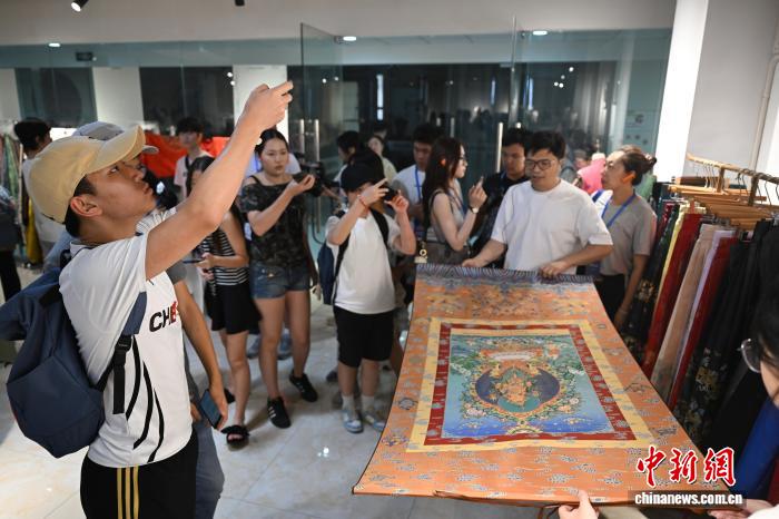 8月7日,欧洲华裔参观拍摄唐卡丝绸织锦画。中新社记者 王刚 摄