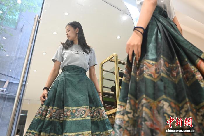 8月7日,欧洲华裔体验和展示马面裙。中新社记者 王刚 摄