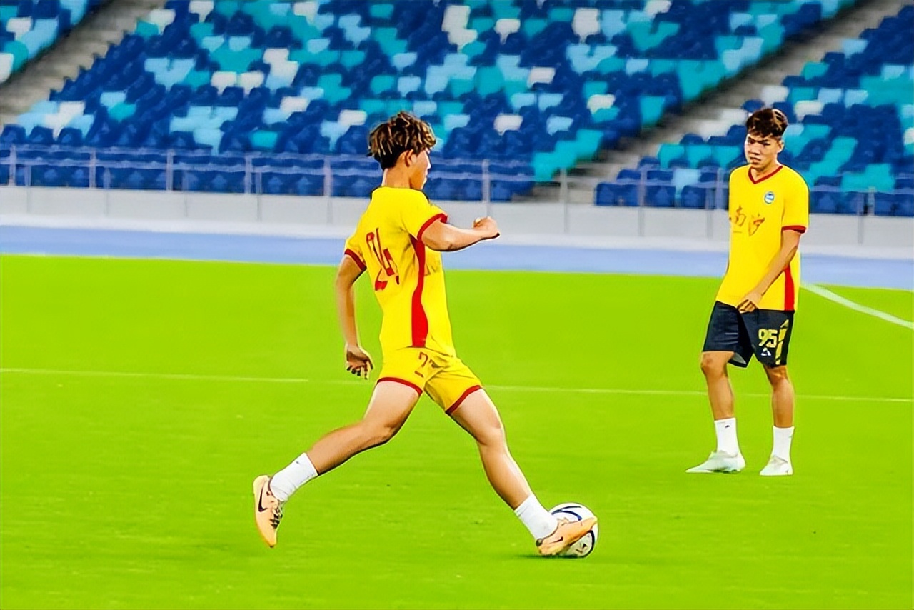 广州湾区青年队在大湾区文化体育中心体育场踢球热身。