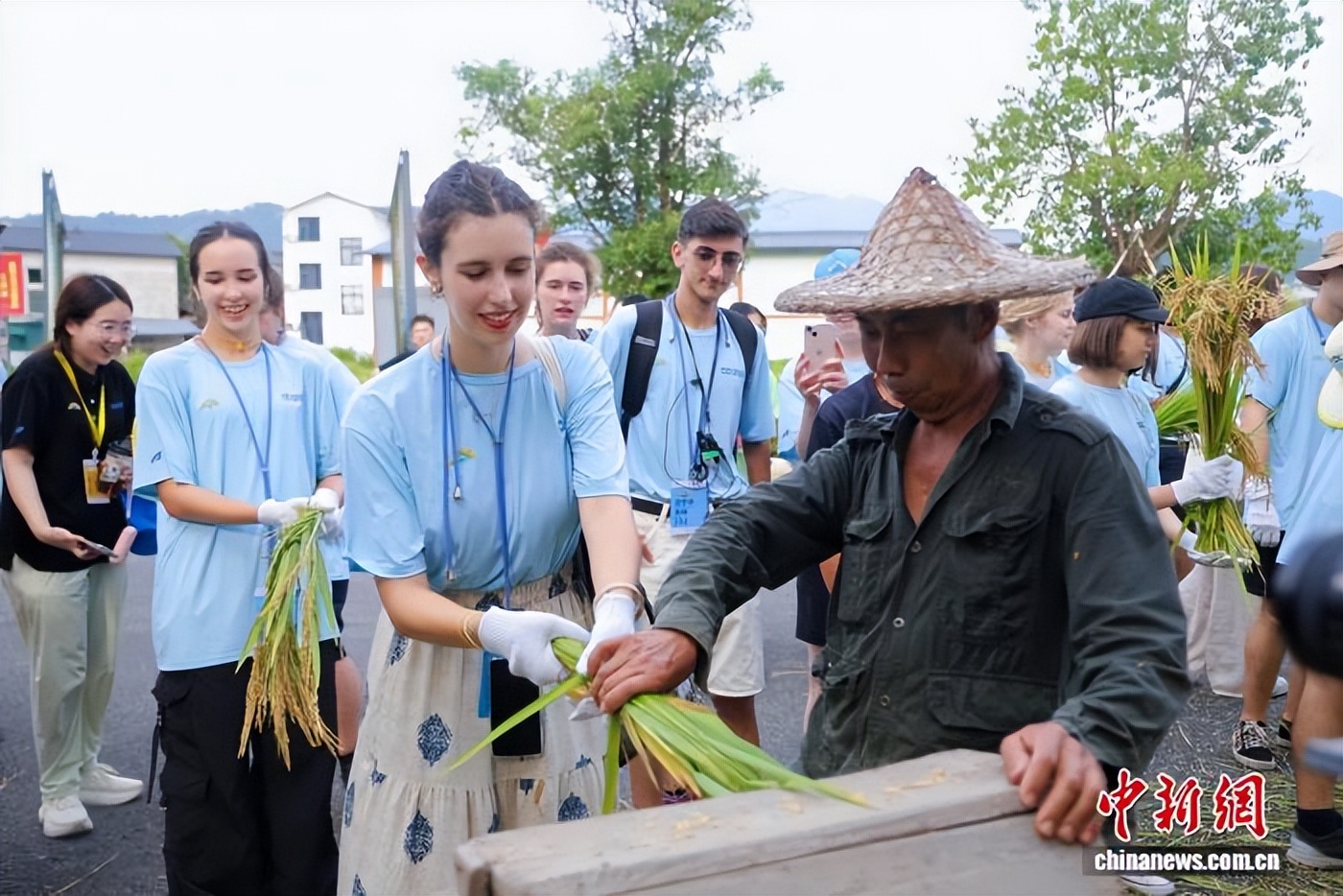 8月10日,来自世界各地的大学生在武夷山五夫古镇体验稻谷机器打穗。福建省广播影视集团供图