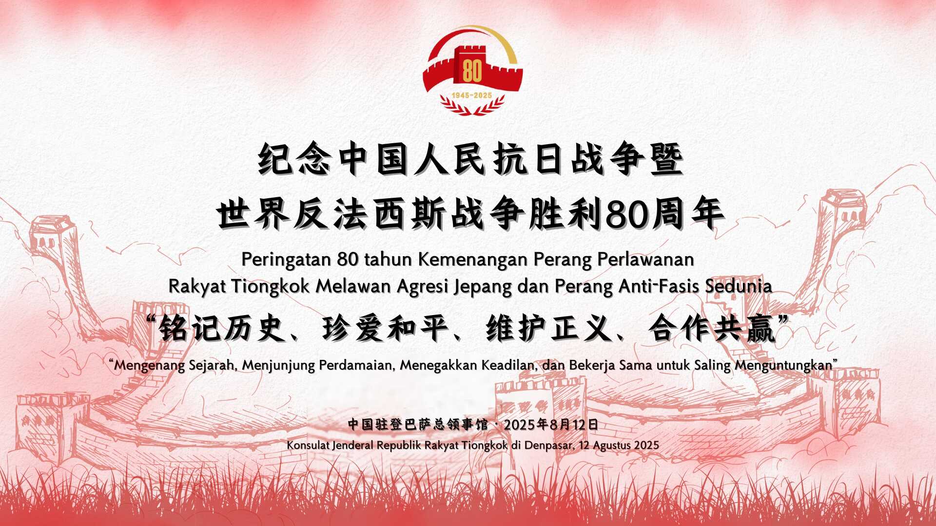 欢迎各位出席中国驻登巴萨总领馆举办的座谈会,共同纪念中国人民抗日战争暨世界反法西斯战争胜利80周年。