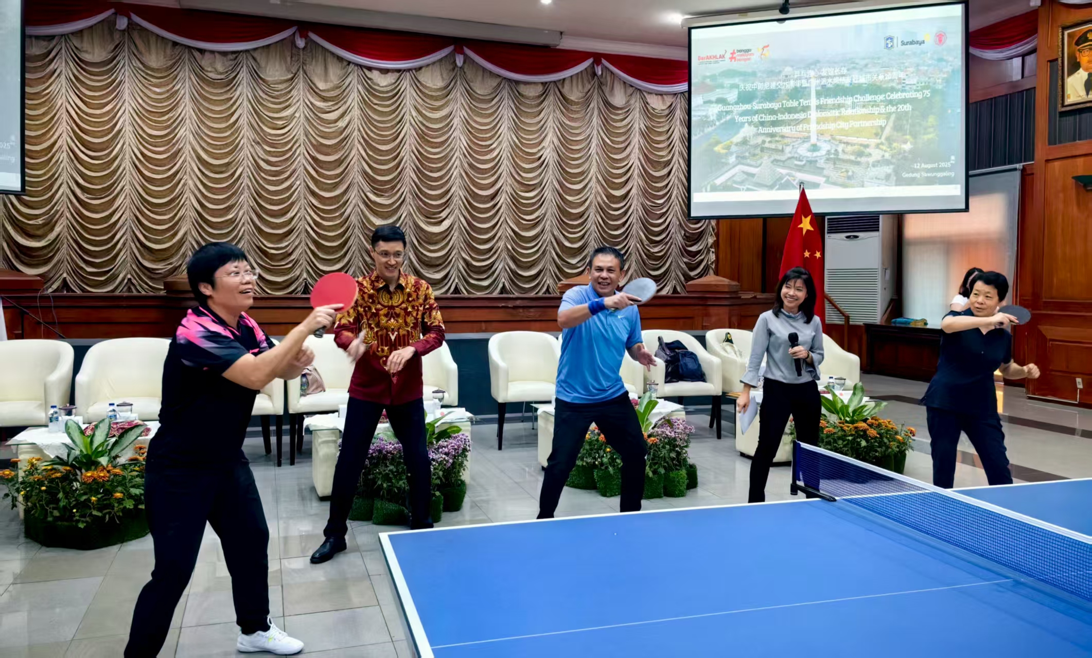 据中国驻泗水总领馆消息,8月12日,谭大有代总领事应邀出席广州与泗水结好20周年乒乓球交流活动,泗水市政府代表伊尔万局长、广州市外办代表团一行、泗水市中印尼乒乓球爱好者50余人参加。