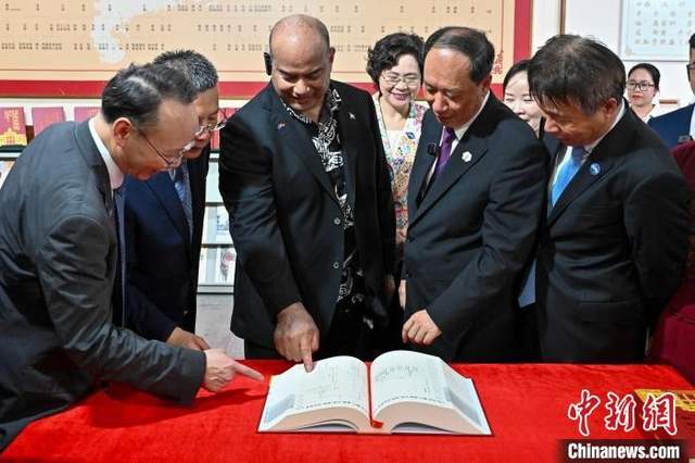 7月8日,在位于广东江门赤坎镇的司徒氏图书馆,瑙鲁总统戴维·阿迪昂(左三)查看族谱。中新社记者 陈骥旻 摄